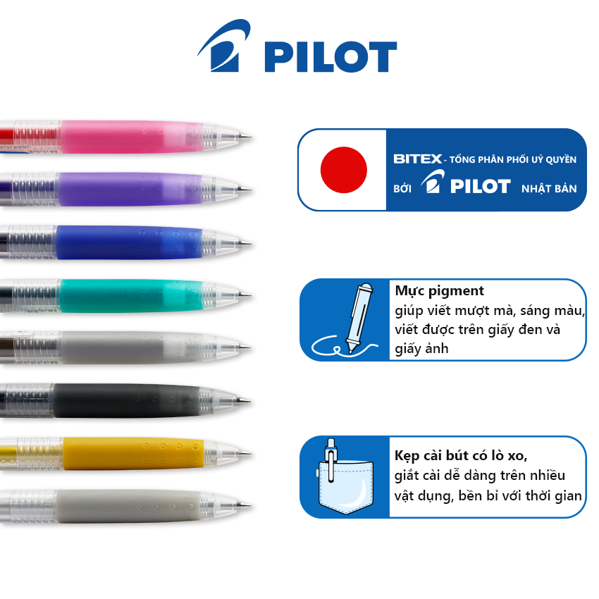 | Đặc điểm | Với hệ mực pigment mới giúp viết rất êm, màu sắc tươi sáng, mực bền với nước và ánh sáng Giắt bút được thiết kế thông minh, dễ dàng giắt bút vào áo và có móc treo để trang trí Dùng để trang trí |