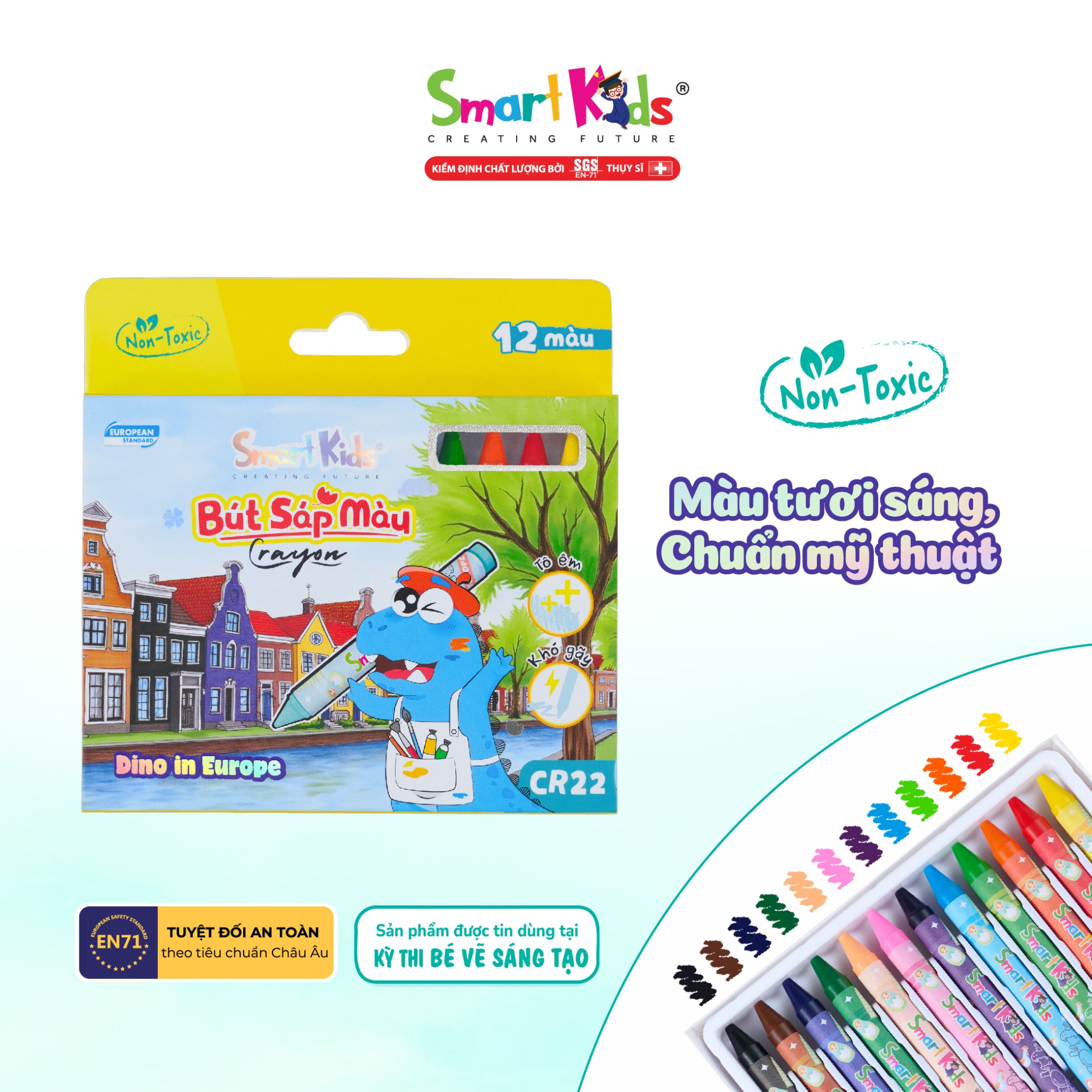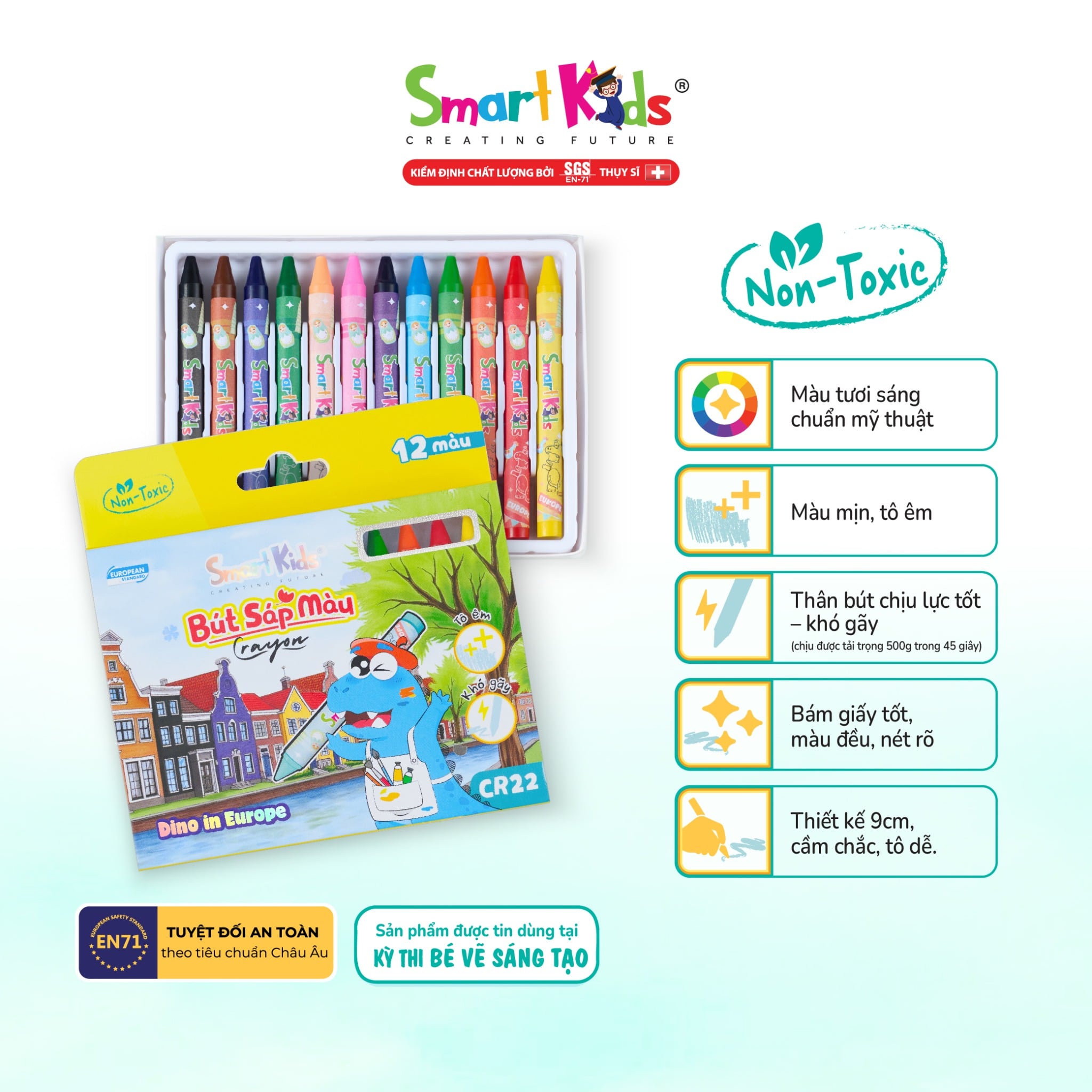 Được sản xuất từ nguyên liệu không độc hại, không chứa chì hay hóa chất gây hại, bút sáp màu Smartkids đảm bảo an toàn cho bé trong suốt quá trình học tập và vui chơi sáng tạo.
