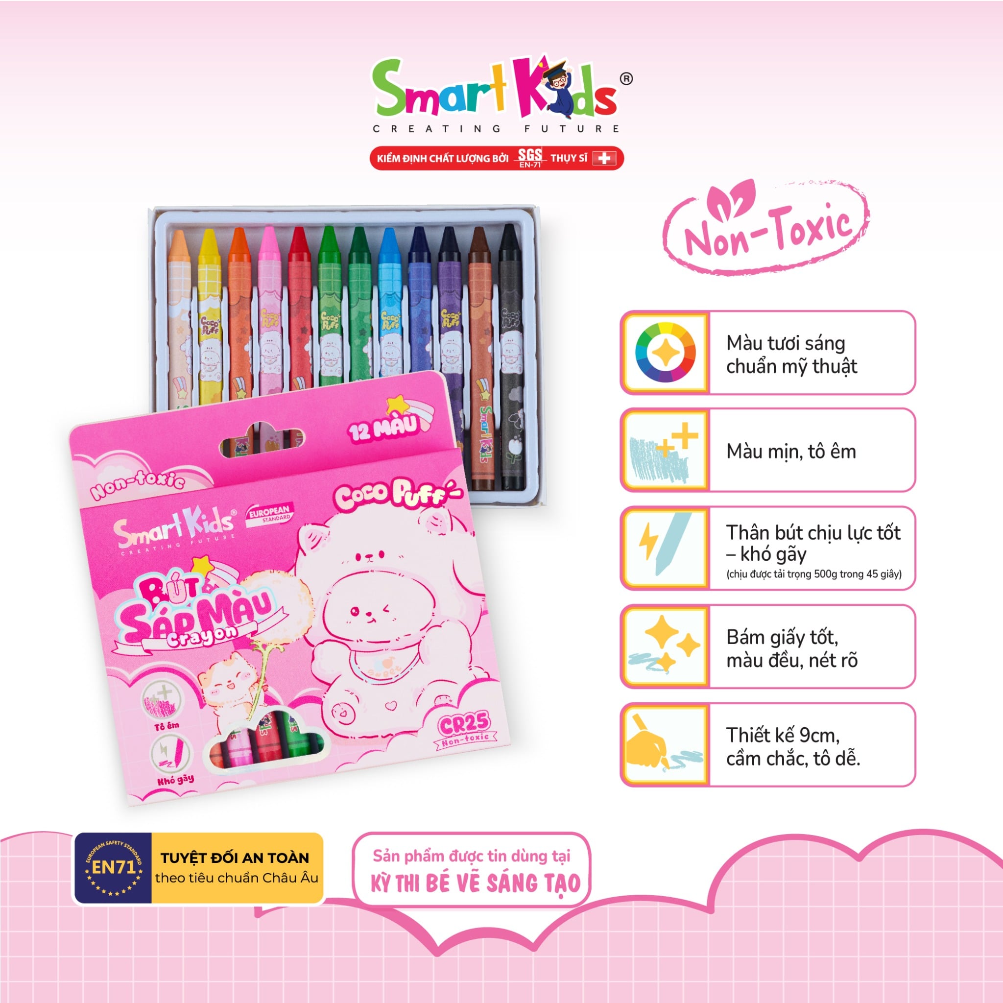 Được sản xuất từ nguyên liệu không độc hại, không chứa chì hay hóa chất gây hại, bút sáp màu Smartkids đảm bảo an toàn cho bé trong suốt quá trình học tập và vui chơi sáng tạo.